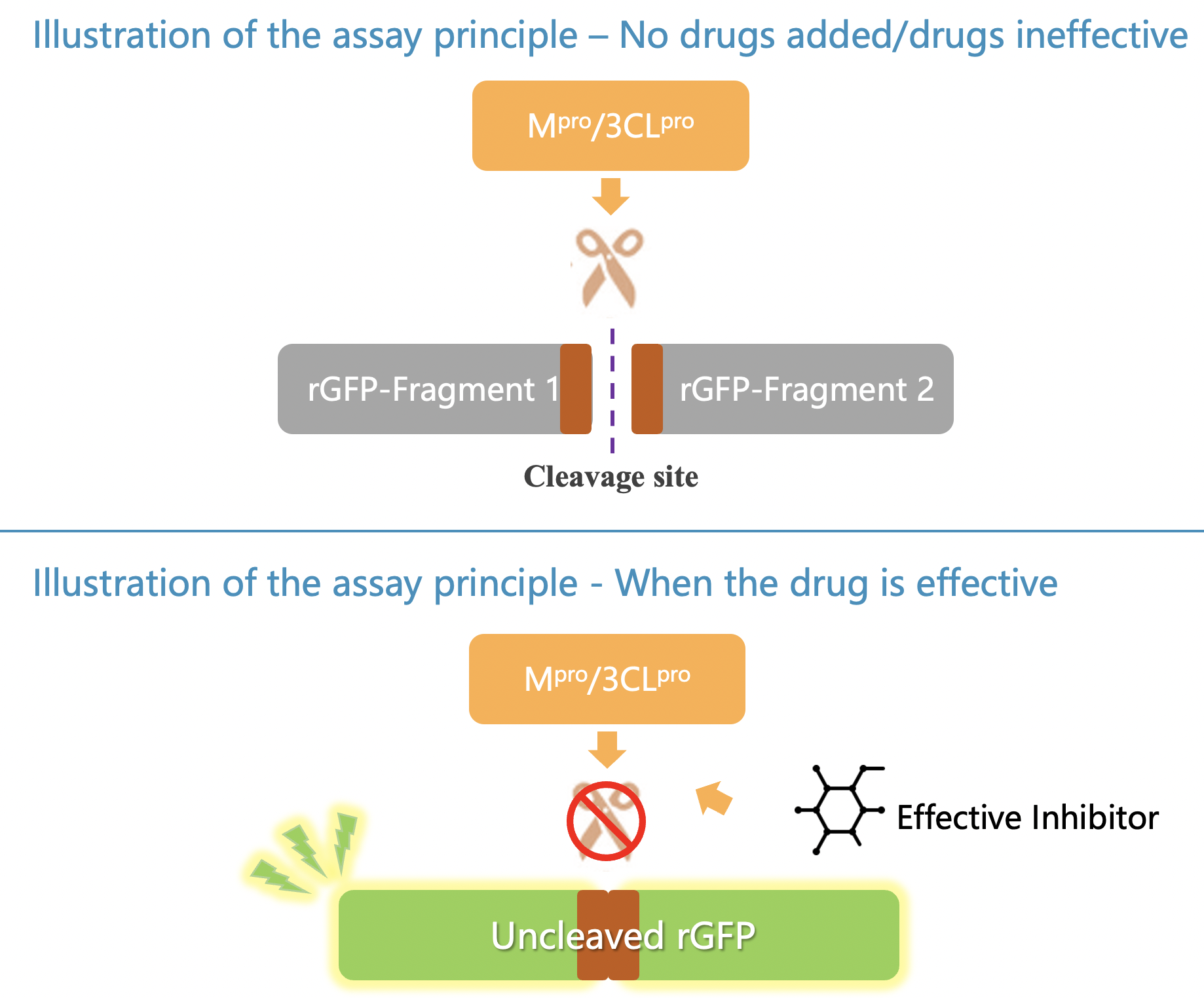 Conversely, when the inhibitor effectively suppresses the activity of the 3CL protease, the 3CL protease fails to cleave rGFP, thus maintaining fluorescence, resulting in increased fluorescence intensity. Drug efficacy is positively correlated with fluorescence intensity, providing a more intuitive positive screening method.