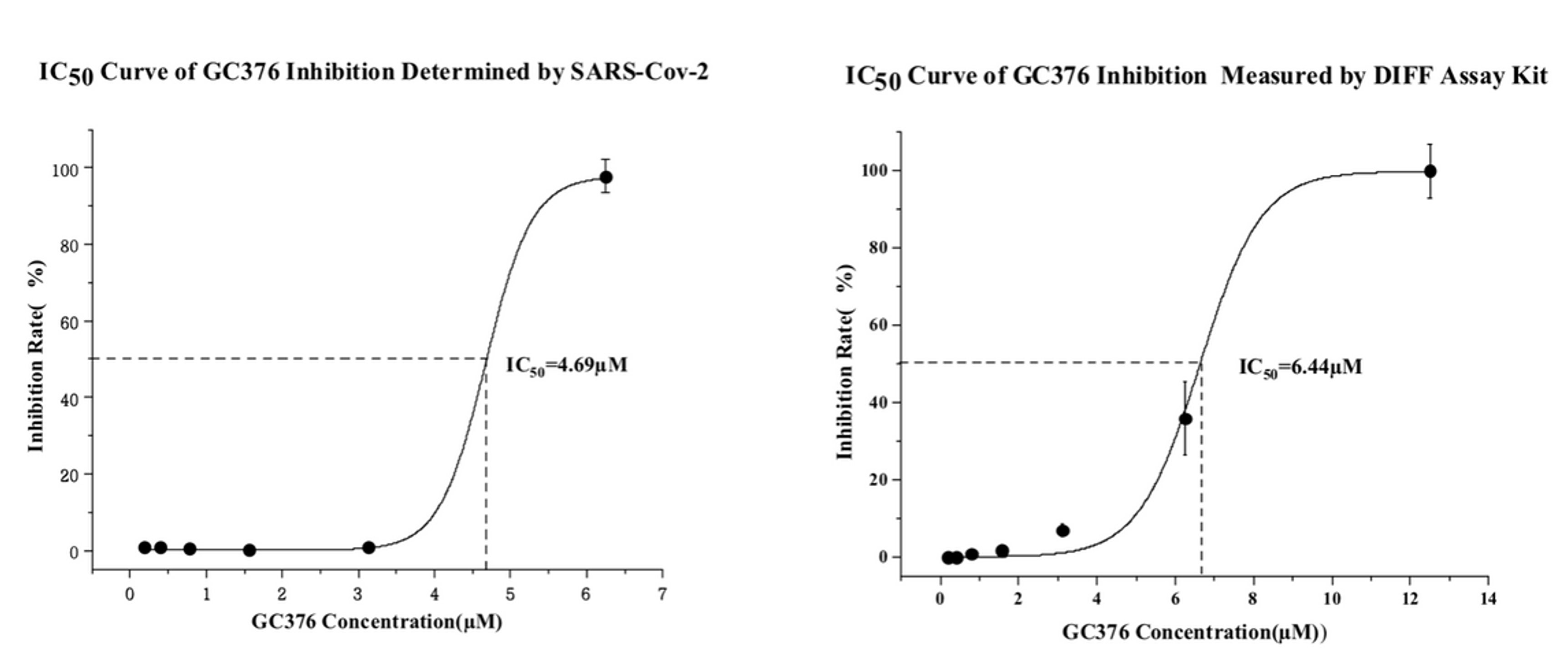 When using live virus for testing, the IC50 value for GC376 is 4.69 μM; using DIFF Biotech’s screening system, the IC50 value is 6.44 μM. The IC50 values obtained by the two methods are highly similar.