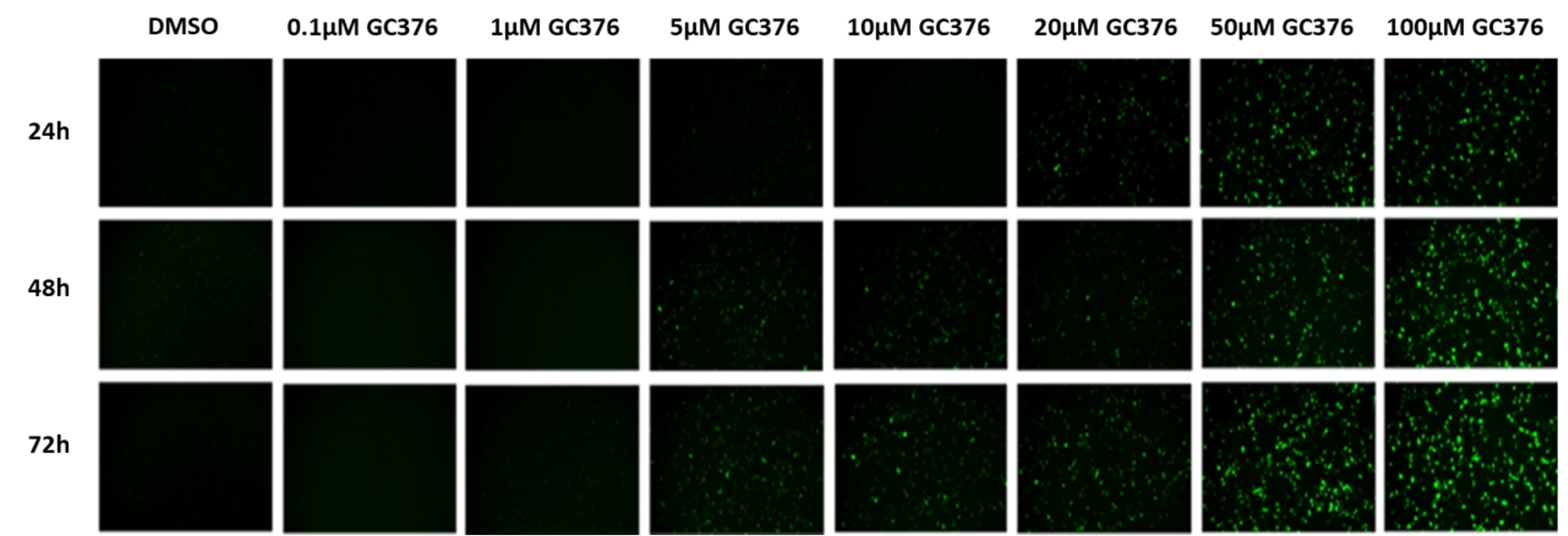 After adding different concentrations of novel coronavirus 3CL protease inhibitors, the GFP expression in cells at 24h, 48h, and 72h is shown in the following figure: