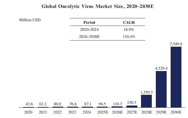 The global oncolytic virus therapy market is projected to grow from USD 87.1 million in 2024 to USD 7,549 million by 2030 (Frost & Sullivan). Despite this rapid growth, only a limited number of oncolytic virus therapies are approved worldwide, highlighting a blue-ocean opportunity for innovative candidates like DIFF-OV 001.
