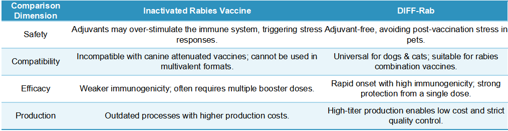 DIFF-Rab represents a major advancement in veterinary preventative care, addressing stress and variable efficacy issues associated with conventional vaccines. It delivers a safer, more potent, and more convenient solution to protect pets against rabies.